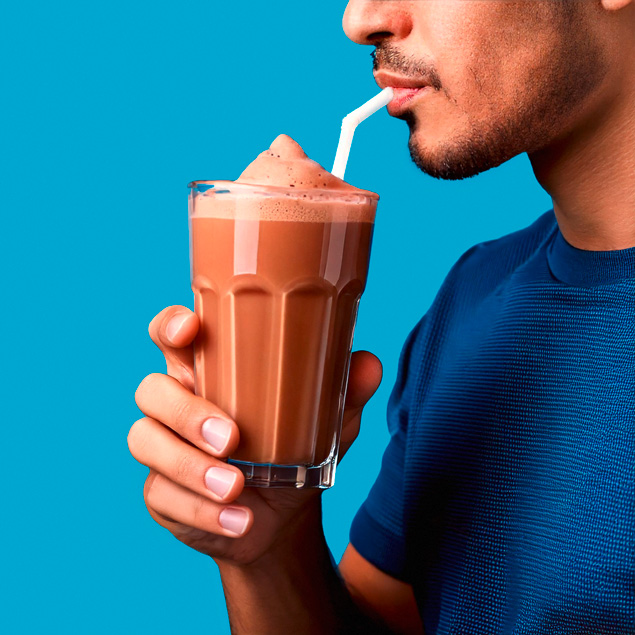 Batido proteico sabor chocolate listo para tomar tanto en frío como a temperatura ambiente en cualquier lugar sin necesidad de preparación.